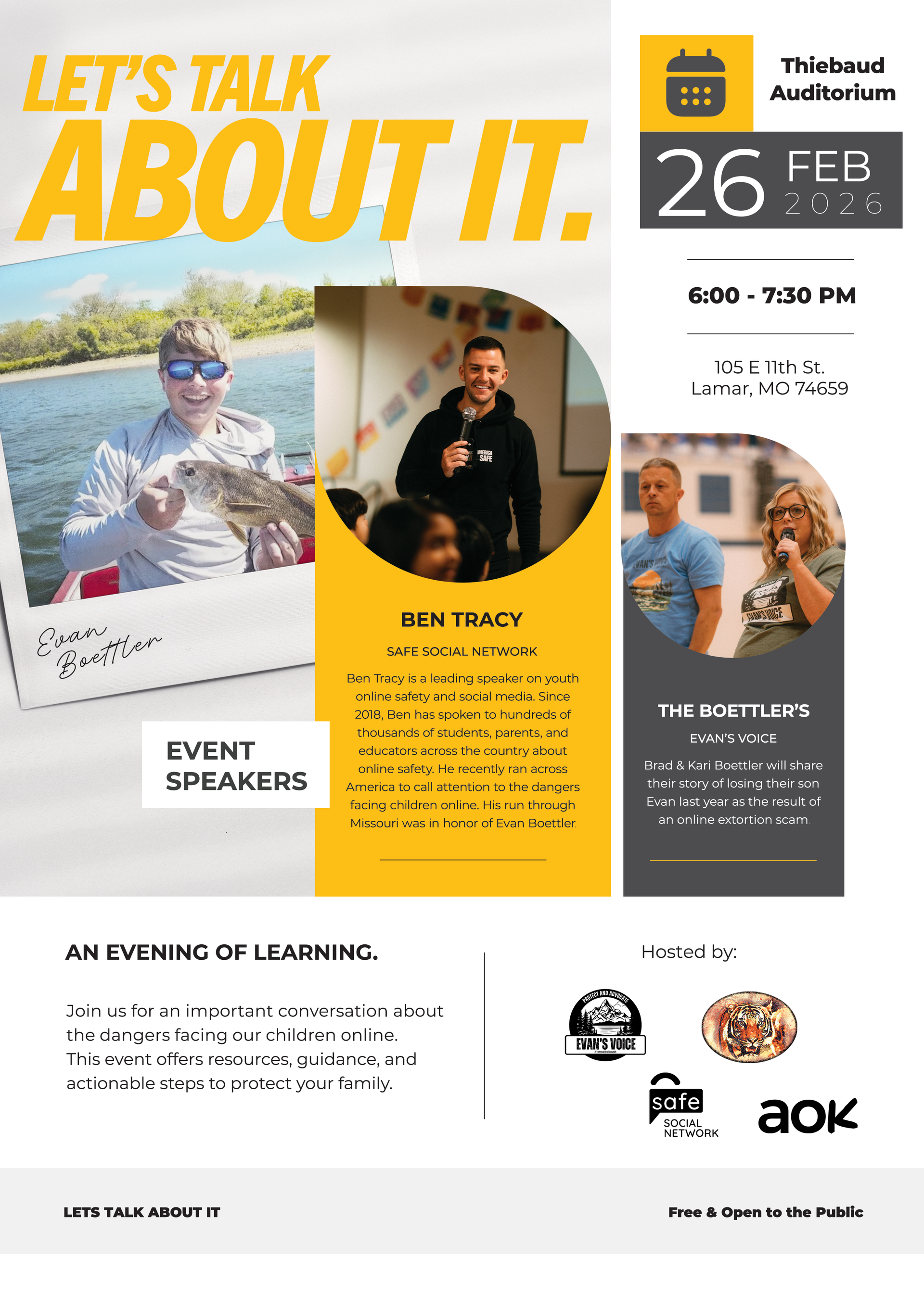#LETSTALKABOUTIT: Ben Tracy, The Boettlers, and Secret Service representatives from the National Center for Missing and Exploited Children will be in Lamar, Missouri, on February 26th, 2026. During the day, there will be presentations for students; the community will be open at 6:00 pm Doors open at 5:00 with a host of community vendors sharing resources.